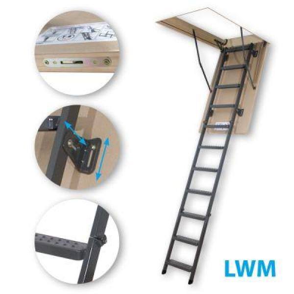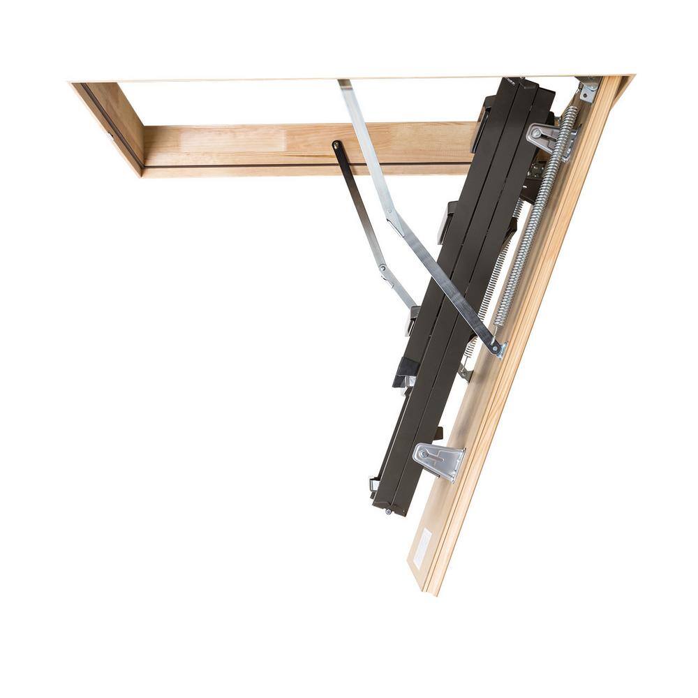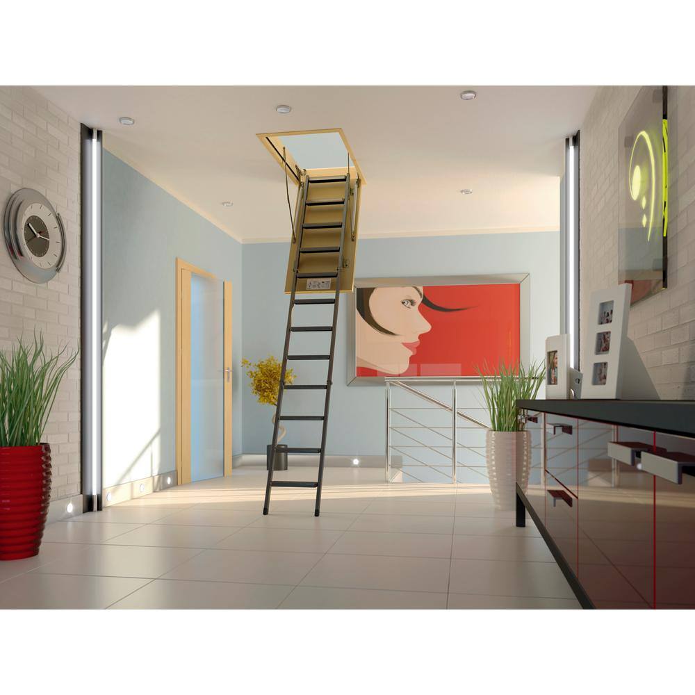 This elegant, superior quality Fakro Insulated Steel Attic Ladder fits in R.O. 25 in. x 54 in. and ceiling heights 7 ft. 11 in. to 10 ft. 1 in. Durably built from powder painted metal, it is assembled in three sections and equipped with a locking mechanism installed inside an insulated and sealed door panel. The ladder length can be adjusted within 1.3 in. after cutting the side rails to set it evenly on the floor or if adjustment is needed following floor renovation. Twelve steps feature a tread rise of about 10 in. to ensure safety and comfort, while small, easy-to-grasp side rails along the entire staircase offer additional security, and brackets help increase space between the ladder and attic door for easy functionality. With springs on the door surface to make attic entry wide and comfortable, the door boasts a well-balanced design that opens and closes easily with no sudden movements.