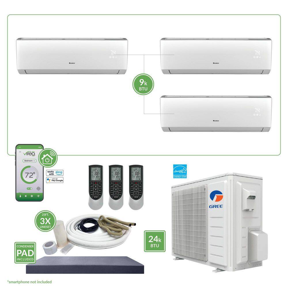 System includes a 2-Ton outdoor multi-unit, 39,000 BTU Smart Home/Wi-Fi enabled GEN3 Vireo wall mount units with remotes, a 25 ft. line set for each indoor head and a plastic compressor mounting pad