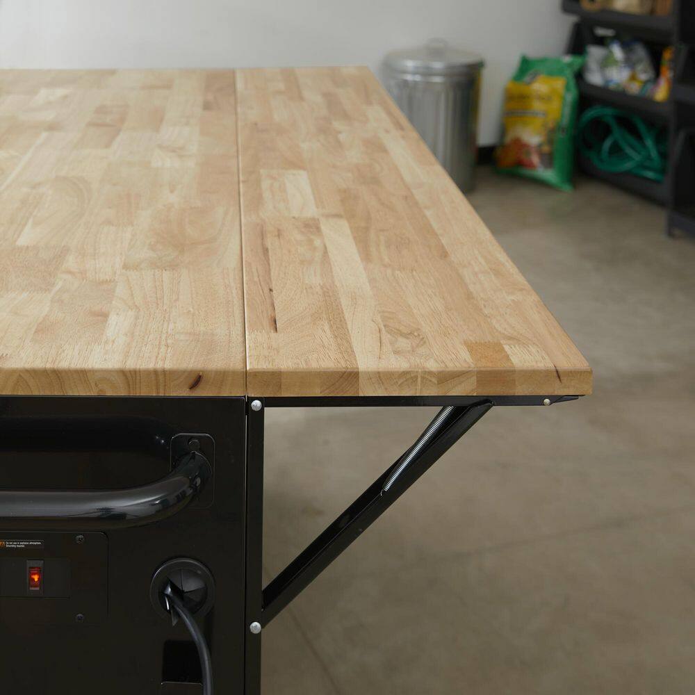 1 in. thick solid woodwork surface with protective coating and additional full length fold up wood top for additional work space